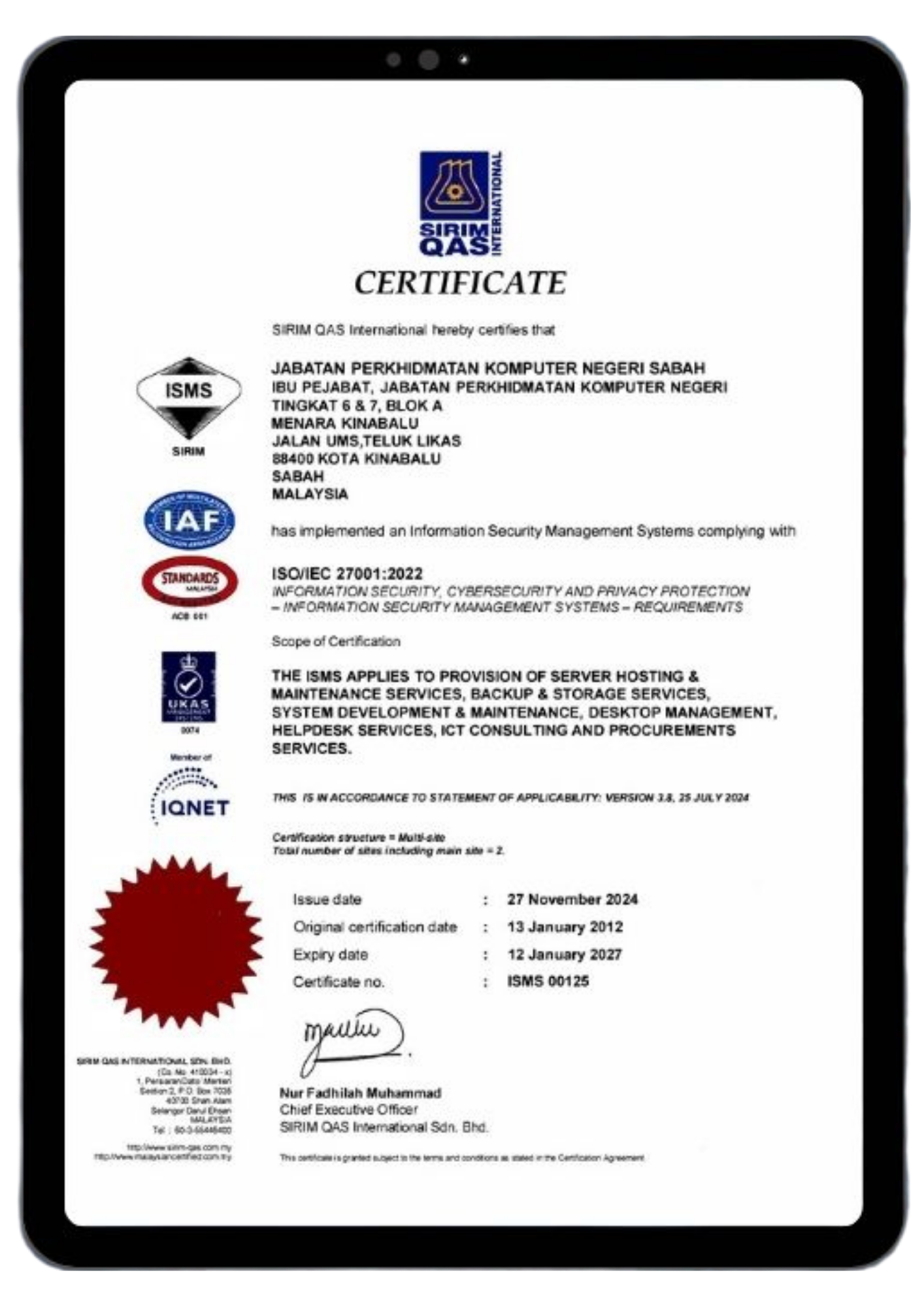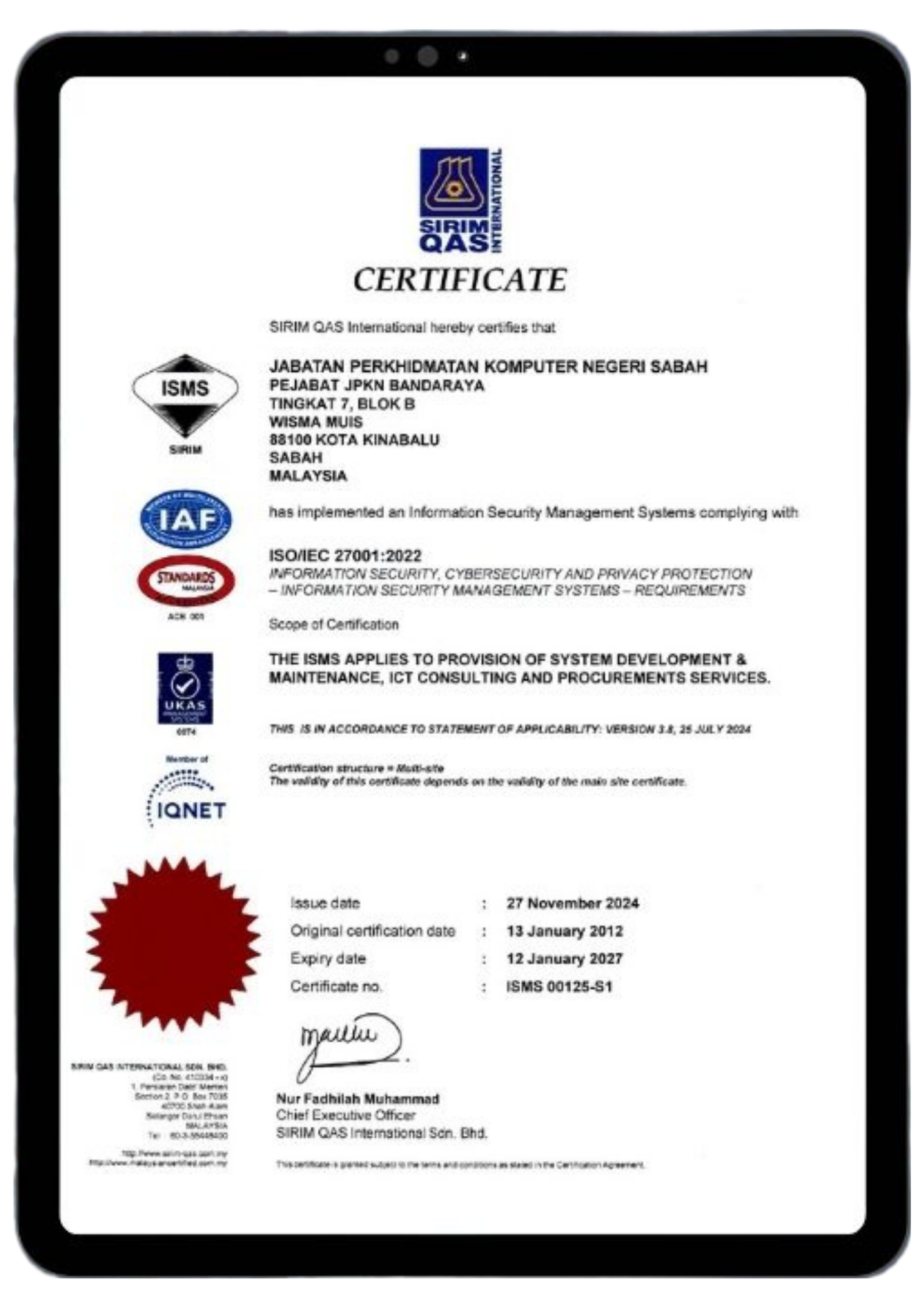JPKN telah memperolehi pensijilan MS ISO/IEC 27001:2022 Sistem Pengurusan Keselamatan Maklumat (Information Security Management Systems) (ISMS) daripada pihak SIRIM QAS International Malaysia Sdn. Bhd. Tempoh sah sijil Yang dikeluarkan pada 27 November 2024 selama 2 tahun 1 bulan 16 hari akan berakhir pada 12 Januari 2027.